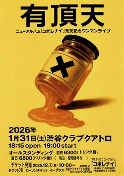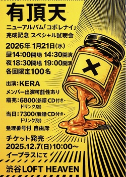 渋谷 CLUB QUATTRO 「有頂天 ニューアルバム『コボレナイ』発売記念ワンマンライブ」 有頂天 今日は渋谷 CLUB QUATTROへ、「有頂天 ニューアルバム『コボレナイ』発売記念ワンマンライブ」を観に行く。10日前のアルバム試聴会に続く、ニューアルバム発売記念ライブ。予習はバッチリという感じでライブに臨む。早め早めの行動で、17時20分過ぎに渋谷へ到着。しばらく時間調整して、会場へと向かう。予定通り18時15分に開場。整理番号21番で入場。ステージ下手端の2列目をキープ。QUATTRO名物の邪魔な柱とステージに挟まれるエリア。ゆったり観られるので意外とイイかも。だけどフロア全体が見渡せないので、お客さんがどれぐらい入っているのかわからない。それでも見える範囲ではお客さんでギッシリ埋まっている。発売記念ライブだもの、ぶわぁーーっといこう! 予定時間の19時を少し過ぎたころ開演。SEが流れる中、Drums:ZIN、Bass:KUBOBRYU、Guitar:COU、Keyboards:CHOUX、Vocal:KERA がステージに登場。肩の部分がとがっている黄色と黒を基調にした新しい衣装を着ている。演奏は「サングラスにプールを」から始まり、「サルビアの花」「ジャム」とニューアルバムの曲が続く。映画「ストリート・キングダム」の試写会を観たという話から、新譜が出来た時の喜びを語るKERAさん。そんな気持ちをふまえつつも、「もっとサティスファイド」「ミシシッピ」とお馴染みのナンバーを演奏。このバランス感覚が“有頂天”。新しいだけでもダメ、懐かしいだけでもダメ。まさに現在進行形。再びニューアルバムから「コボレル」「偉大なる生活者の代償」を演奏したあと「PIPE」。これまたレアな曲が飛び出したな。続けてクボさんのセリフが印象的な「monkey's report(ある学会報告)」。そして「卒業」「ルール」を演奏して、20時10分ごろ第1部は終了。休憩時間をはさんで、20時25分頃から第2部がスタート。まずはニューアルバムから「2026年のカラフルメリィ」「ヌードの季節」。どちらも“有頂天”らしさ満点。今回の衣装は篠原ともえがプロデュースして布袋寅泰や“B'z”の衣装を手掛けている安藤慶次さんが作ったという話や、アルバムジャケットは緒川たまきさんがAIで作ったという話など、いろいろな裏話が飛び出す。そして「これからの有頂天」「イエローマン」「孤独の発明」とニューアルバムの曲を立て続けに演奏。「グッズはアクスタだけが何故か売れる」という話から「これからは演奏でなくアクスタ中心でいきます」とKERAさんは言い、「シュート・アップ」「猫が歌う希望の歌」「君はGANなのだ」と、お馴染みの曲を続けて披露。「君はGANなのだ」なんて不謹慎な歌詞と言えばそれまでだけど、何故か心に沁みてくるんだよなぁ〜。最後に「千の病を持つ男」「フューチュラ」を演奏して本編は終了。 アンコール、メンバーが再びステージに登場してセッティング。「ベジタブル」が始まり、KERAさんが唄い出す。このクールな感じも“有頂天”。今日のセットリストはニューアルバムからの選曲と、これまでの集大成と言えるような選曲の組み合わせ。「嫌な世の中になってきましたけど、まだまだ行きますんで。ついてきてください」とKERAさんは言い、「ニューウェイヴに愛を込めて」という紹介でニューアルバムから「ニューウェイヴ」を披露。KERAさんの思いが感じられて、なんだかとてもグッときてしまった。僕はこのサウンドに生かされている。2回目のアンコールは動画撮影OK。「撮ってイイと言うと本当に撮るね」とKERAさん。演奏されたのは「HAPPY SLEEP」。いろいろな思いが駆け巡る、いいライブだった。21時40分ごろ終演。 かなり遅くなってしまったので渋谷で呑むのは諦めて、バスに乗って地元まで戻る。そして駅前の「磯丸水産」で打ち上げ。土曜日のこの時間だというのに、けっこう賑わっている。カウンター席に座って、いつものように呑み喰いする。マンネリを避けるため、いつもとは違う料理も注文。今日もイイ一日だった。24時半ごろおひらきにして帰宅。 【セットリスト】