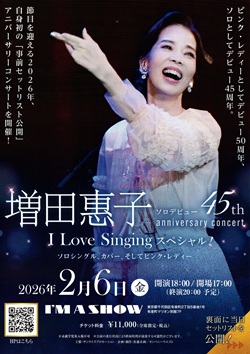 I'M A SHOW 「増田惠子 ソロデビュー 45th anniversary concert I Love Singing スペシャル!」 増田惠子 今日は有楽町 I'M A SHOWへ、「増田惠子 ソロデビュー 45th anniversary concert I Love Singing スペシャル! ソロシングル、カバー、そしてピンク・レディー」を観に行く。ケイちゃんソロデビュー45周年、今回はセットリストを事前公開するという新しい試み。ソロシングル曲とカバー曲、そして“ピンク・レディー”ナンバーという構成。こいつは楽しみ。15時には仕事を切り上げて、ちょっと早めに出かける。千代田線に乗り込み、霞ヶ関駅で下車。日比谷公園と日比谷野音がどうなっているのか? 自分の目で確かめておきたくて。野音は高い柵で囲われていた。建物自体はまだ残っているけど、時間の問題かな。公園もあちこちに柵が張り巡らされて、ちょっと悲しくなってしまった。これも時代か・・・。開場時間の17時が近づいてきたので、会場のI'M A SHOWへと向かう。ココにはもう何度か来ているけど、どこに入口があるのかわかりにくい。かなり並んでいたので、ちょっと時間調整して17時半ごろ会場入り。発売されたばかりのCD「ゴールデン☆ベスト 増田惠子 シングル&恋するお友達」を買うとサイン色紙がもらえるということだったけど、惜しいところで予定の100枚が終了。その代わりに握手券をもらう。ケイちゃんと話せるのだからイイや。そういう心遣いがありがたい。今日の席はB列15番。ステージ真正面の2列目。マイクスタンドが目の前にある感じ。ちょっと緊張する。 ほぼ予定通り18時過ぎに開演。ドラム、ベース、ギター、キーボード、ピアノという編成のバンドとコーラスのYUKAちゃんがステージに登場。インストに続いてソロ1stシングル「すずめ」から演奏はスタート。ドレッシーな白の衣装を着たケイちゃんが唄い出す。続いて中島みゆきのカバーで「時代」。ソロシングルを作詞・作曲したアーティストの曲をカバーしていく趣向らしい。2ndシングル「ためらい」は松任谷由実の作詞・作曲ということで、松任谷由実のカバー「春よ、来い」。3rdシングル「らせん階段」は竹内まりやの作詞・作曲ということで、竹内まりやのカバー「人生の扉」。4thシングル「女優」は桑田佳祐の作詞・作曲ということで、“サザンオールスターズ”のカバー「涙のキッス」。ケイちゃんはちょっと緊張している模様。それにつられて会場全体が硬い感じだったけど、次第にイイ雰囲気に。心を込めて歌を唄うケイちゃんだからこそ、ケイちゃんの気持ち次第でその場の空気も変わるということかな。「女優」では、デザイナーのコシノヒロコさんからこの歌にあわせてプレゼントされたという着物を羽織って熱唱。ケイちゃんのソロ活動の歴史を振り返るような内容。ちょっと飛んで10枚目のシングル「最後の恋」、そしてその曲の作曲した加藤登紀子のカバー「百万本のバラ」を唄って、第1部は19時05分過ぎに終了。 休憩時間をはさんで、19時35分過ぎから第2部がスタート。バンドの演奏が流れる中、ピンクのフリンジのついたミニのドレスでケイちゃんが登場。シュープリームスの「Stop In The Name Of Love」、そしてキャロル・キングの「It's Too Late」。ケイちゃんの原点、“ピンク・レディー”の原点がここにある。ケイちゃんも楽しそうに唄っている。続いて、フランスデビューアルバム「voice cologne」の収録曲「Avec Le Feu」を披露。歌詞はもちろんフランス語。「30年以上ぶりに唄うって自分で決めたんですけど、すっごい後悔しちゃって。音源が出ればすぐ思い出すかなと思っていたら全然ダメ。フランス語の先生に来ていただいて丸暗記しました。トシを重ねても大きな目標を掲げて、それを達成したときには素晴らしい景色が見える。皆さん、遅くないですよ。自分がやりたいことをやりましょう! 私ができたんですから」とケイちゃん。これでホッとしたのか? ここからはいつものケイちゃんノリ。“ピンク・レディー”ナンバーのコーナーが始まる。「UFO」から始まって「渚のシンドバッド」「サウスポー」。もちろんお客さんも総立ちになって振り付けを踊る。大盛りあがりの中、発表されたセットリストには無かった「ペッパー警部」も追加で披露。あぁ〜楽しかった。 アンコールに突入して、バンドメンバーと黒いケープをまとったケイちゃんが再びステージに登場。「いやぁ〜楽しかった。ありがとう! みんな大好きー。セットリストを公開して唄う試み、おもしろかったです。こうして唄って踊るのが、今の私の幸せです。もっといい歌を届けられるように一生懸命に精進していきます」とケイちゃん。最後に中島みゆきの「慕情」を唄って、20時35分ごろ終演。 【セットリスト】