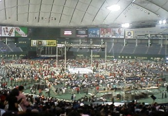 毎度おなじみ東京ドーム。いつも思うが、座席の狭さには閉口する。隣のひととぴったり密着という感じ。しかし、ふとみるとところどころの一帯ががらがら。2面特設されているオーロラビジョンの影になっているところとか、ビデオカメラの影とか。そこは駄目だとしても、たぶん照明をたてるポールの影になるため空席にしているような席があったのだが、なんか観やすそうな感じがした。そこで途中から席を移動してみたのだが、なかなか広々としてご機嫌だった。最終的には5列目まで進出してしまい、とても特をしたような気がする。
